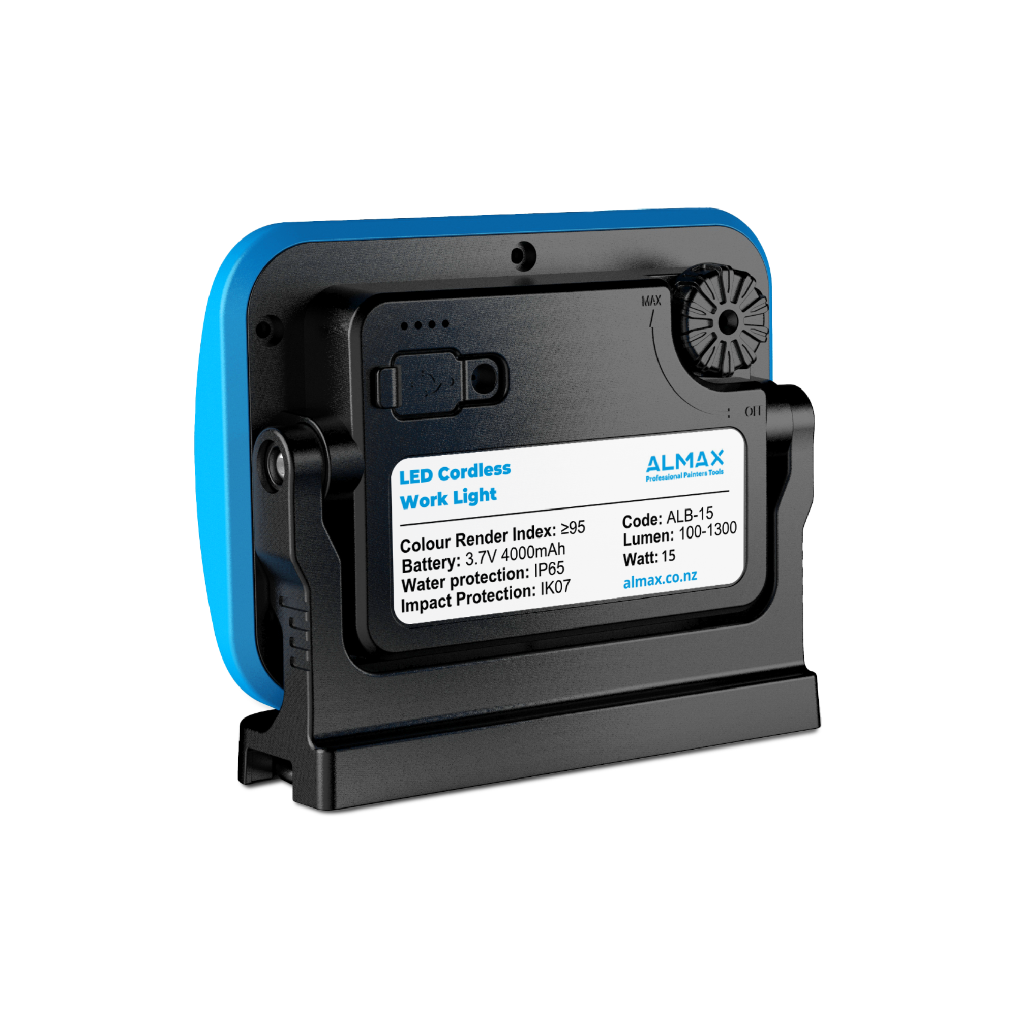 Description: Almax Leopard 15W Cordless LED Work Light with Colour Match function. A rugged all-purpose LED wit]h impact and water resistant design for demanding job site conditions. High Colour Render index CRI>95 can be used for true colour matching.