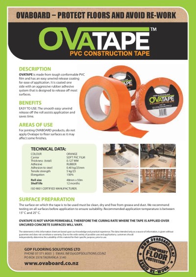 Description: OVATAPE is made from tough PVC film for many uses in construction and with joining OVABOARD™ in particular. • Easy unwind but strong rubber adhesive. • Designed to release easily from most surfaces. • Test on substrate before use. • Roll is 48mm wide x 50 metres long. • Do not apply directly to new concrete floors. • 24 per carton.